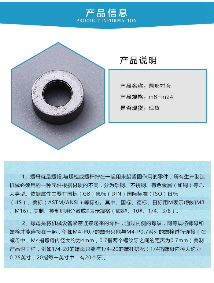 圓形襯套螺母的使用範圍大,種類也比較多,要選擇合適的圓形襯套螺母,就必須 考慮它的使用目的,不同的工況選擇不同型號的圓形襯套螺母。圓形襯套螺母選型中主要考慮的條件是圓形襯套螺母需承受的壓力、速度、壓力速度乘積及載荷性質。另外,圓形襯套螺母是否有潤滑、潤滑的狀態也決定了它的使用效果和壽命。