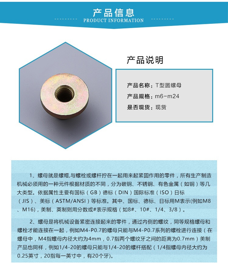 多用於螺紋鎖緊止推,多為細牙螺紋常用於直徑較大的連接。小T型圓螺母用於外徑與厚度較小的結構緊湊的連接。