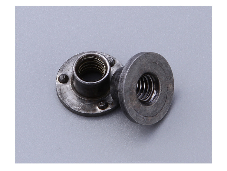 T型焊接螺母材料:素色、發黑、鍍鋅的一般都是普通的碳鋼螺母,T型焊接螺母上一般有性能等級的。不鏽鋼的一般是A2-70.區分碳鋼螺母和不鏽鋼螺母時用磁鐵吸一下就知道,不鏽鋼的不會被磁鐵吸住。不鏽鋼製品一般呈亮銀色。