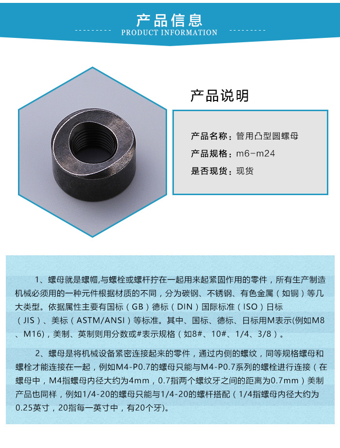 管用凸型圓螺母可以說是在91探花视频在线观看的生活中隨處可見,當然在一定程度上說明91探花视频在线观看的生活與其息息相關,也體現了管用凸型圓螺母的重要程度,因此對管用凸型圓螺母的要求可是額外重要。管用凸型圓螺母有四大材質:碳鋼、不鏽鋼、銅質、合金。碳鋼材質的管用凸型圓螺母可以說是不叫大眾化,也是用量z多的一種,呈黑色狀,整體較為堅硬,不鏽鋼材質的管用凸型圓螺母,則多是運用在一些電子行業、船舶工業、汽車行業等,因其不易生鏽的原因,運用的領域算是不叫了,銅質管用凸型圓螺母可以說是專用於煤礦、電力等需要防爆的領域,合金鋼材質因非常的堅硬耐用,在鐵路交通、采礦設備、石油鑽井則是廣泛使用的一種。
