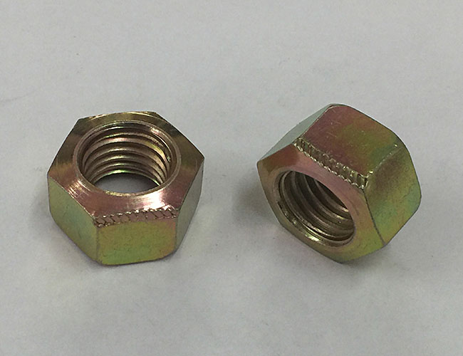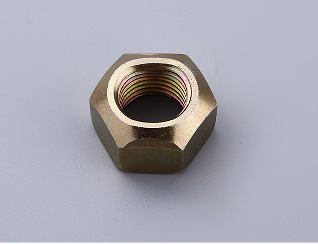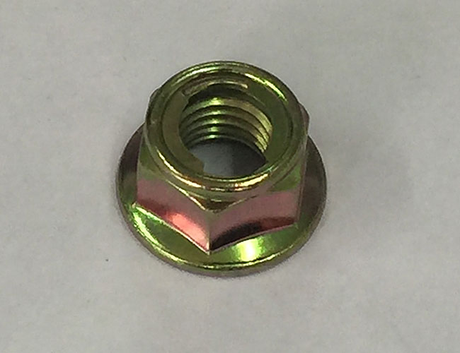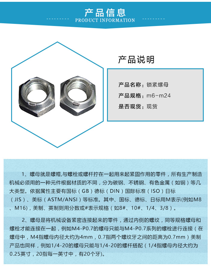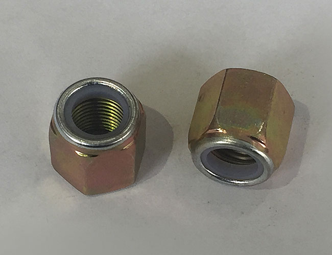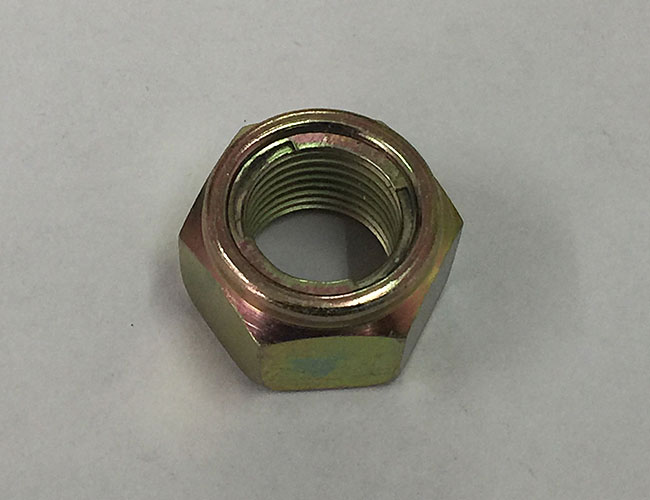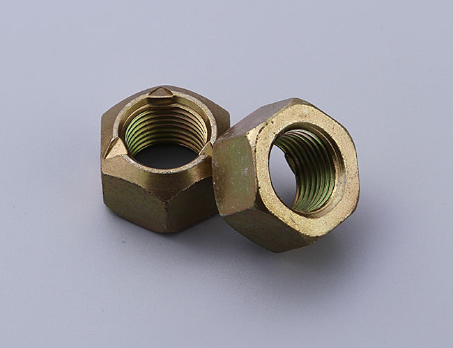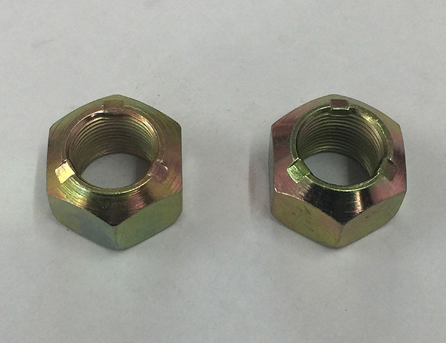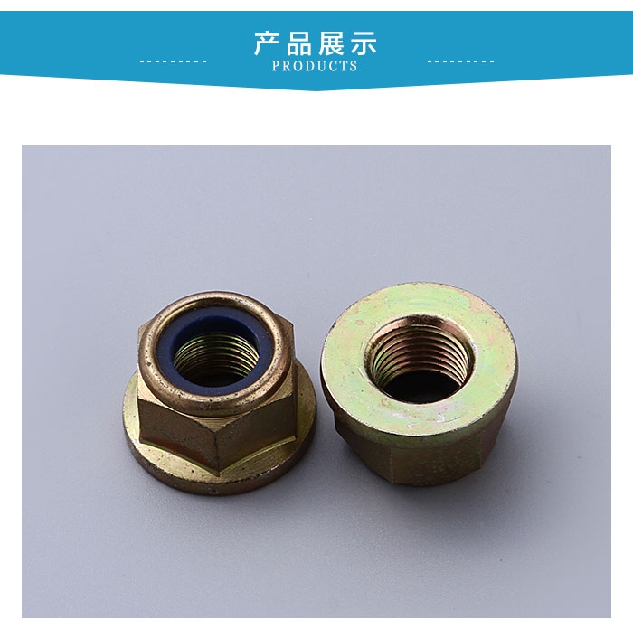 在六角台階壓對邊鎖緊螺母的圓周上開有3個、4個、6個或者8個缺口(視螺母大小和生產廠家產品係列不同而異),這幾個缺口既是擰緊工具的著力點,又是防鬆墊片卡口的卡入處。
