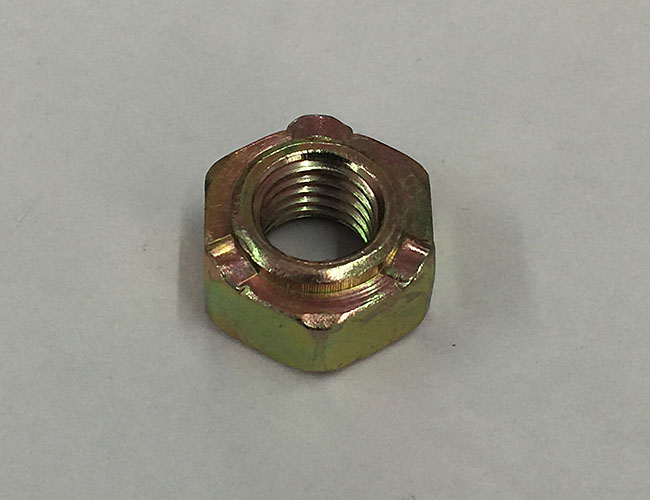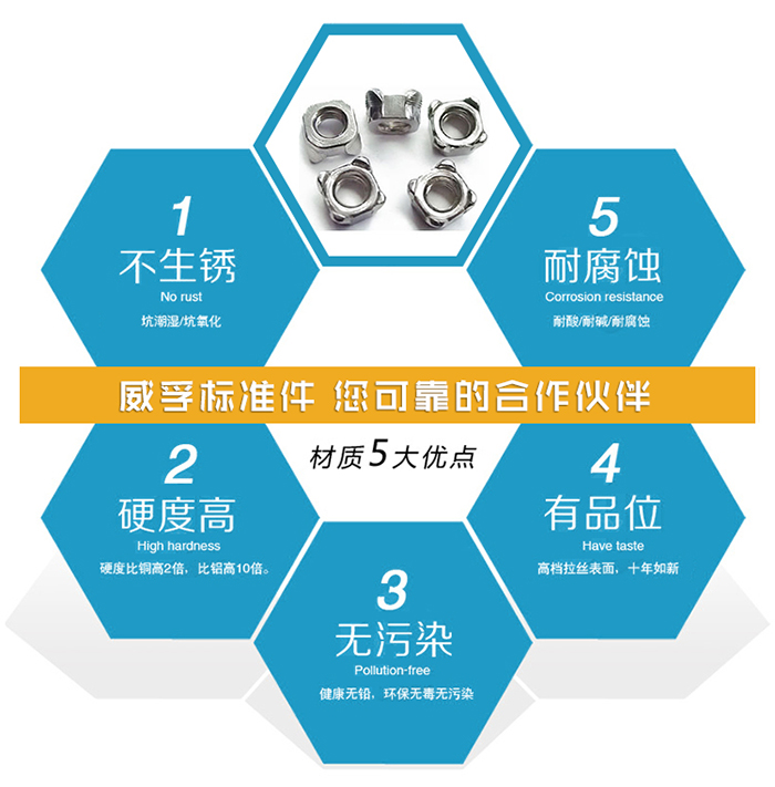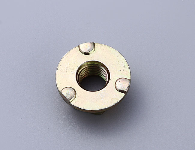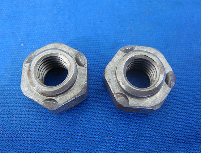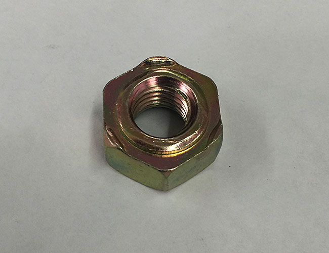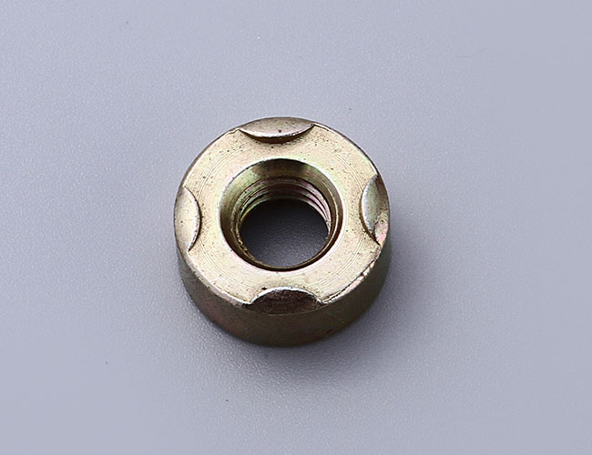 T型焊接螺母,強度比較大,且使用範圍廣,薄厚都可以,但是由於高溫會導致被連接件變形,且不可拆卸,而且一些活潑金屬不能用通常方法焊接,比如鋁,鎂等,需要保護氣或氬弧焊,要求加工工藝和精度。
