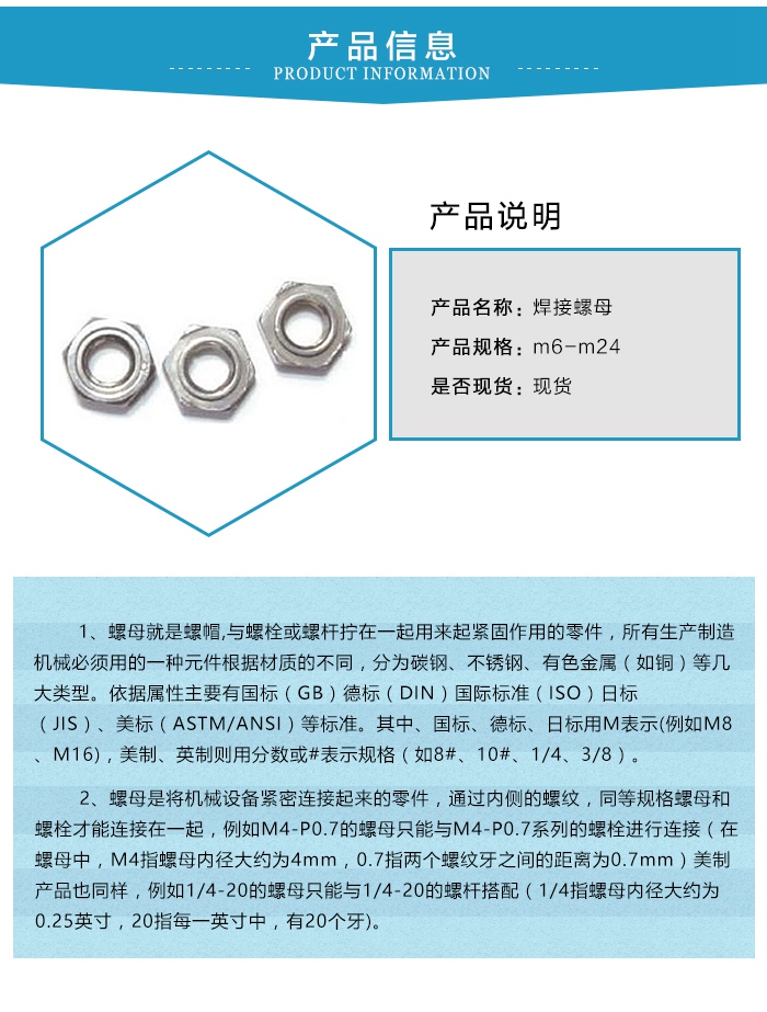 T型焊接螺母是被焊工件的材質(同種或異種),通過加熱或加壓或兩者並用,並且用或不用填充材料,使工件的材質達到原子間的建和而形成性連接的工藝過程, 焊接螺母是具有內螺紋並與螺栓配合使用的緊固件。具有內螺紋並與螺杆配合使用用以傳遞運動或動力的機械零件。