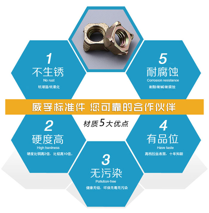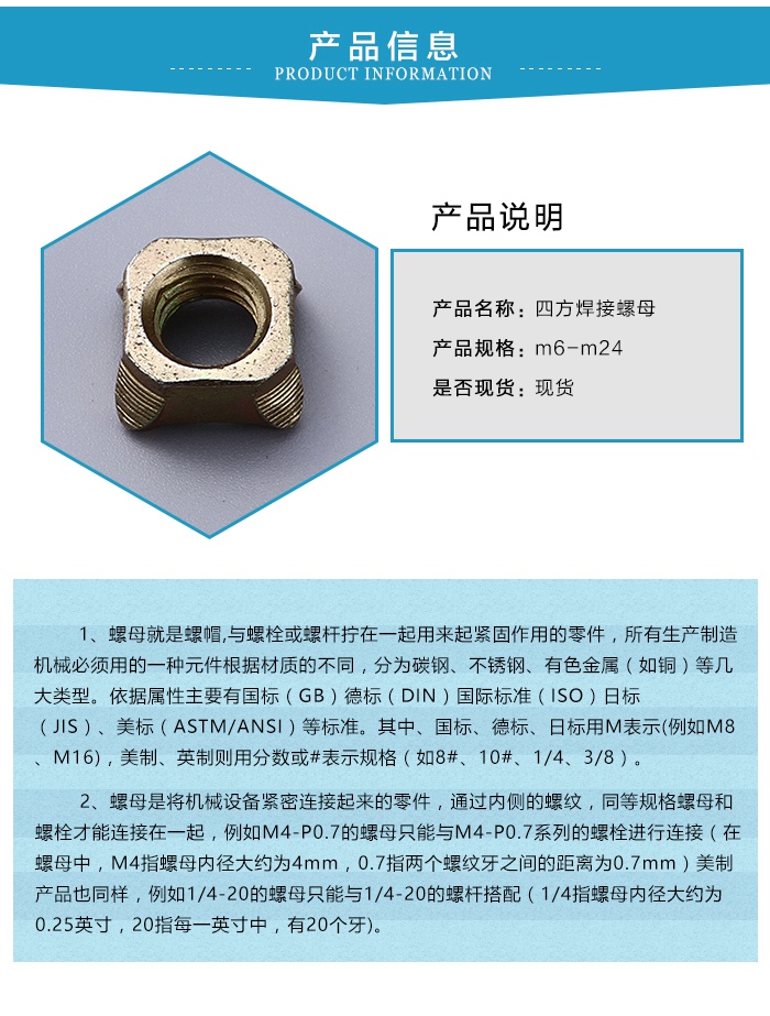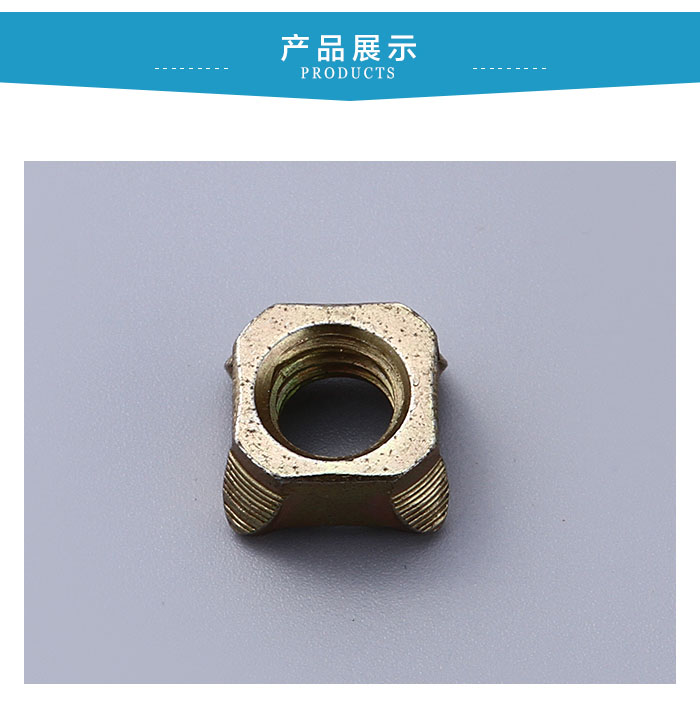 四方焊接螺母是被焊工件的材質(同種或異種),通過加熱或加壓或兩者並用,並且用或不用填充材料,使工件的材質達到原子間的建和而形成性連接的工藝過程, 焊接螺母是具有內螺紋並與螺栓配合使用的緊固件。具有內螺紋並與螺杆配合使用用以傳遞運動或動力的機械零件。