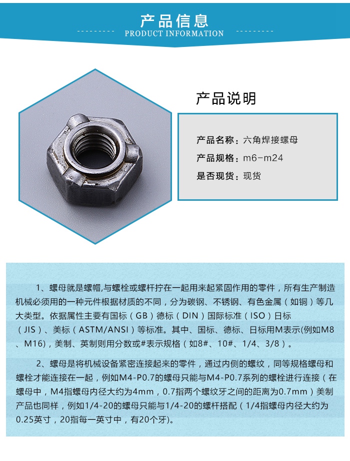 六角焊接螺母是被焊工件的材質(同種或異種),通過加熱或加壓或兩者並用,並且用或不用填充材料,使工件的材質達到原子間的建和而形成性連接的工藝過程, 六角焊接螺母是具有內螺紋並與螺栓配合使用的緊固件。具有內螺紋並與螺杆配合使用用以傳遞運動或動力的機械零件。