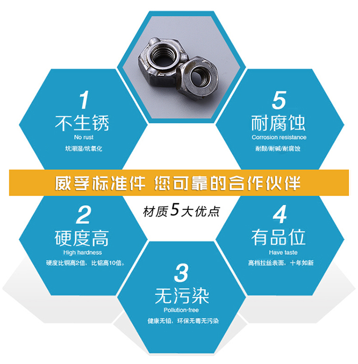 六角焊接螺母具有以下的優缺點:焊接,強度比較大,且使用範圍廣,薄厚都可以,但是由於高溫會導致被連接件變形,且不可拆卸,而且一些活潑金屬不能用通常方法焊接,比如鋁,鎂等,需要保護氣或氬弧焊,要求加工工藝和精度。