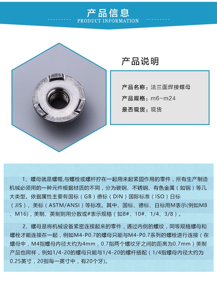 法蘭麵焊接螺母是一種在螺母外適合焊接的螺母,一般是可焊接的材料製成的而且較厚適與焊接,焊接是相當於把兩個分離件變成一個整體,用高溫將金屬融化後混合到一起再冷卻,中間會加入合金,內部是分子力的作用,強度一般比母體強度大。