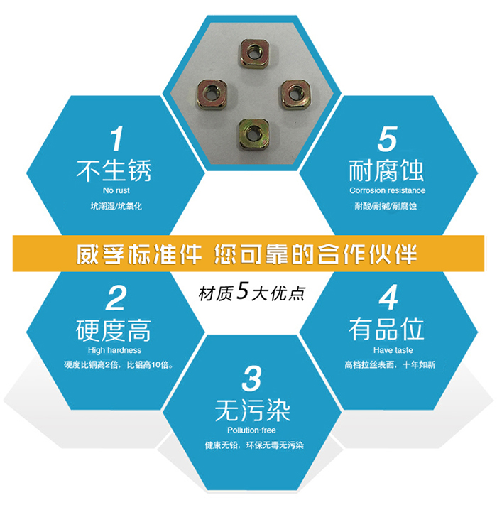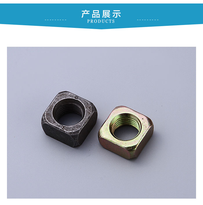 方形螺母表麵處理采用:電鍍白鋅,藍白鋅,五彩鋅,發黑,本色五種表麵處理方式可選。